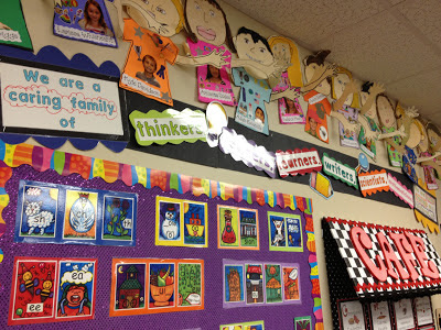 I’m not sure if you can tell in this photo all that is happening. The “people” are one per student and their shirts are decorated with things that are their story ideas. Never at a loss for something to write about in this classroom. Then below it… it says we are a caring family of thinkers… learners… writers… scientists.. mathematicians… etc.