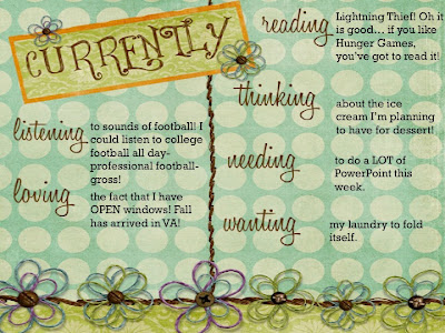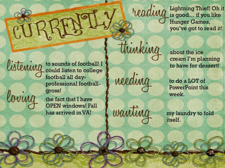 The Frizz says September 17, 2012 at 8:34 pm Lightening Thief is now on my radar! I've been needing a good book to read. I'm two chapter into Conscious Discipline by Becky Bailey. I think you would like it. But it is definitely a dense textbook. I need a good story to get carried away. Oh, and Fall has arrived in Texas as well! It's under 90 degrees today! Hip Hip Hurray 🙂